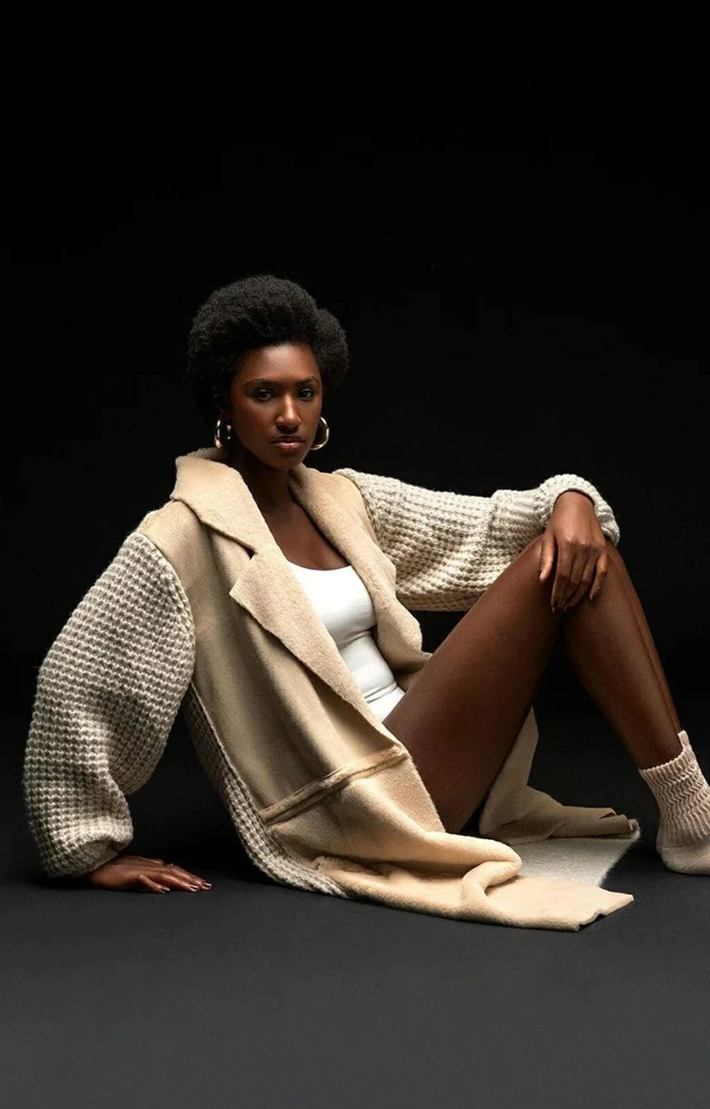 O detalhe em tricô nas mangas e parte de trás não apenas adiciona conforto, mas também aquece em dias mais frios. Este casaco é ideal para criar looks elegantes, seja para um evento formal ou um passeio casual.